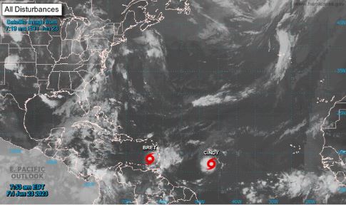 La Oficina Nacional de Meteorología (Onamet), informa que la tormenta tropical Bret se localiza a unos 215 kilómetros al oeste de San Vicente, se mueve hacia el oeste a unos 30 km/h, con vientos máximos sostenidos de 95 km/h. Sus vientos con fuerza de tormenta se extienden hasta 205 kilómetros de su centro.