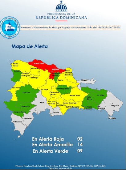 En alerta roja se encuentran Puerto Plata y Espaillat, mientras que en alerta amarilla están Monseñor Nouel, Santiago Rodríguez, Santiago, La Vega, Montecristi, Elías Piña, Valverde, María Trinidad Sánchez, San Cristóbal, Santo Domingo, Distrito Nacional, Monte Plata, San José de Ocoa y Duarte (en especial el Bajo Yuna).